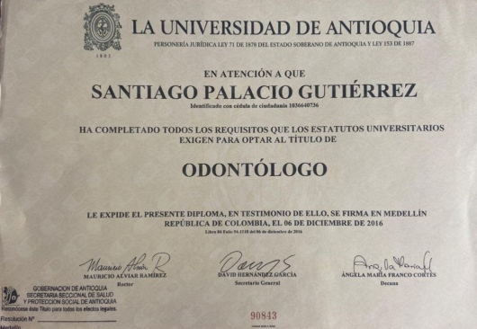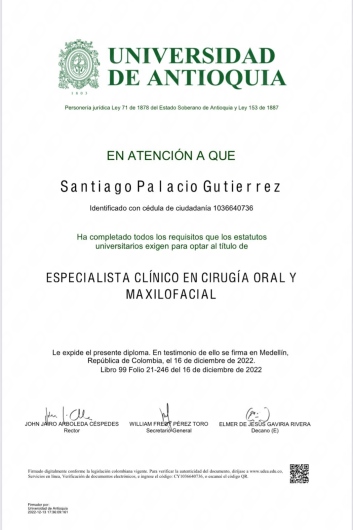 El Dr. Santiago Palacio Gutiérrez es cirujano oral, ortognático y maxilofacial egresado de la Universidad de Antioquia, con enfoque en cirugía ortognática y manejo integral de alteraciones funcionales y estructurales del sistema maxilofacial.